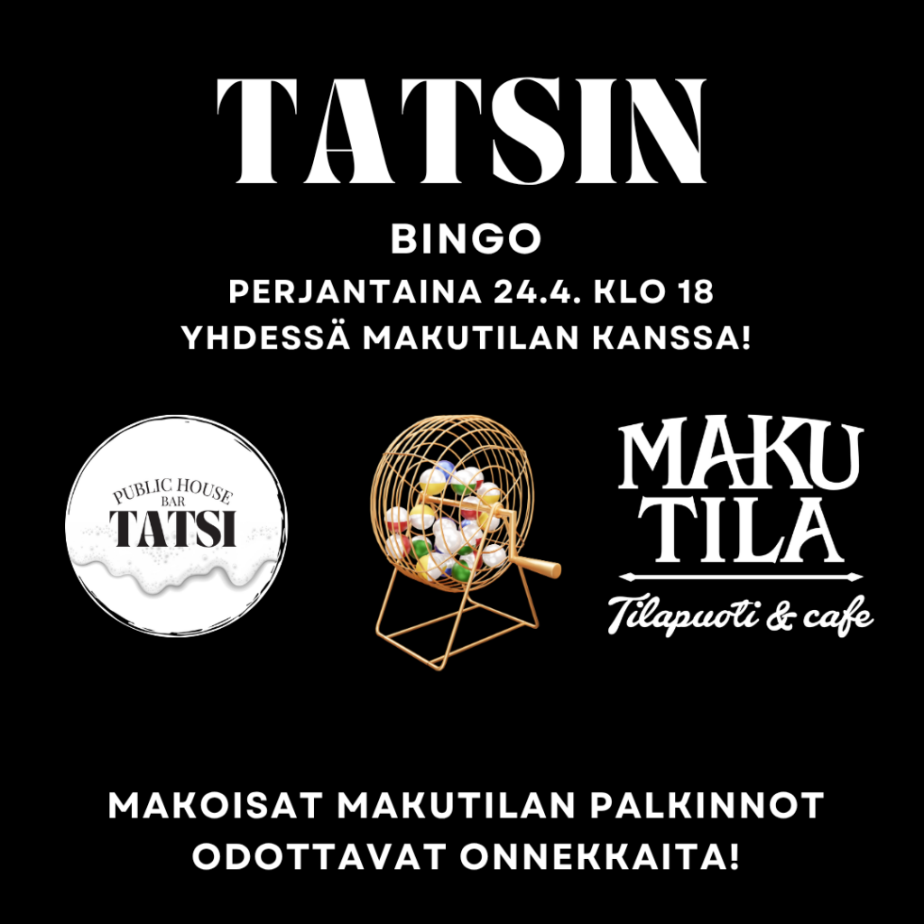 Joka kuun viimeinen perjantai (aloitus 30.1.) Bingo! Kerrytä pisteitä nimimerkillesi ja joulukuussa palkitaan vuoden onnekkain bingoaja! Seuraava bingo Tatsi pubissa on perjantaina 24.4. klo 18!