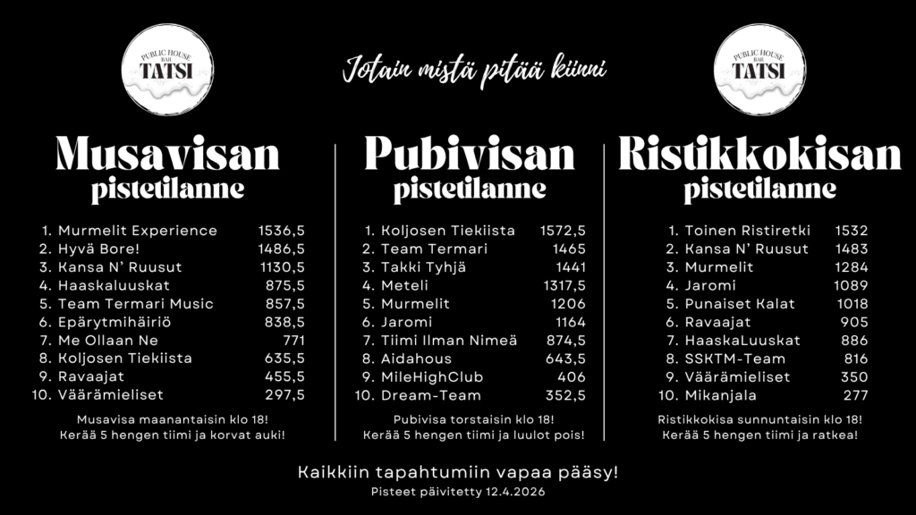 Torstaisin (aloitus 8.1.) klo 18 Pubivisa! Kerää max 5 hengen tiimi ja kerrytä pisteitä kokonaispistetilastoon. Kesäkuun 26 lopussa palkitaan paras tiimi!